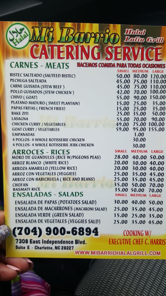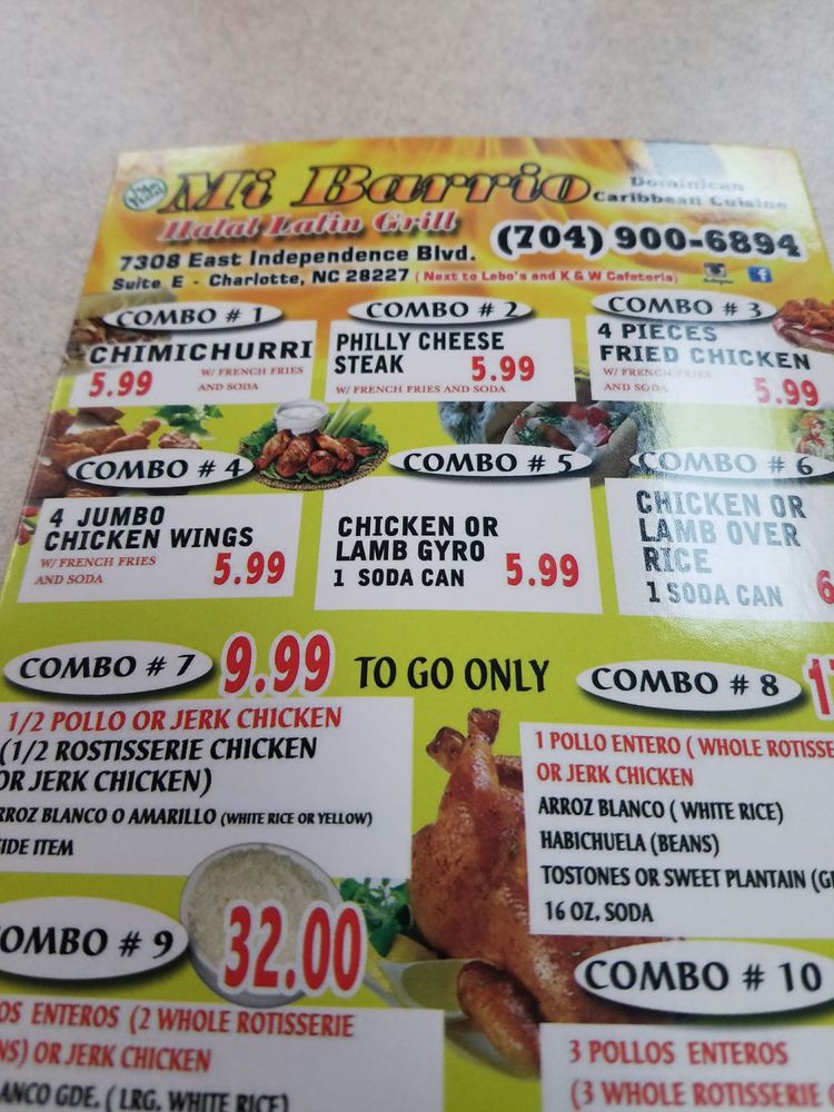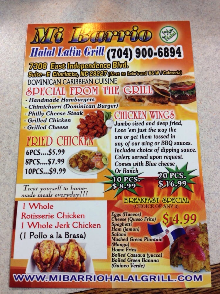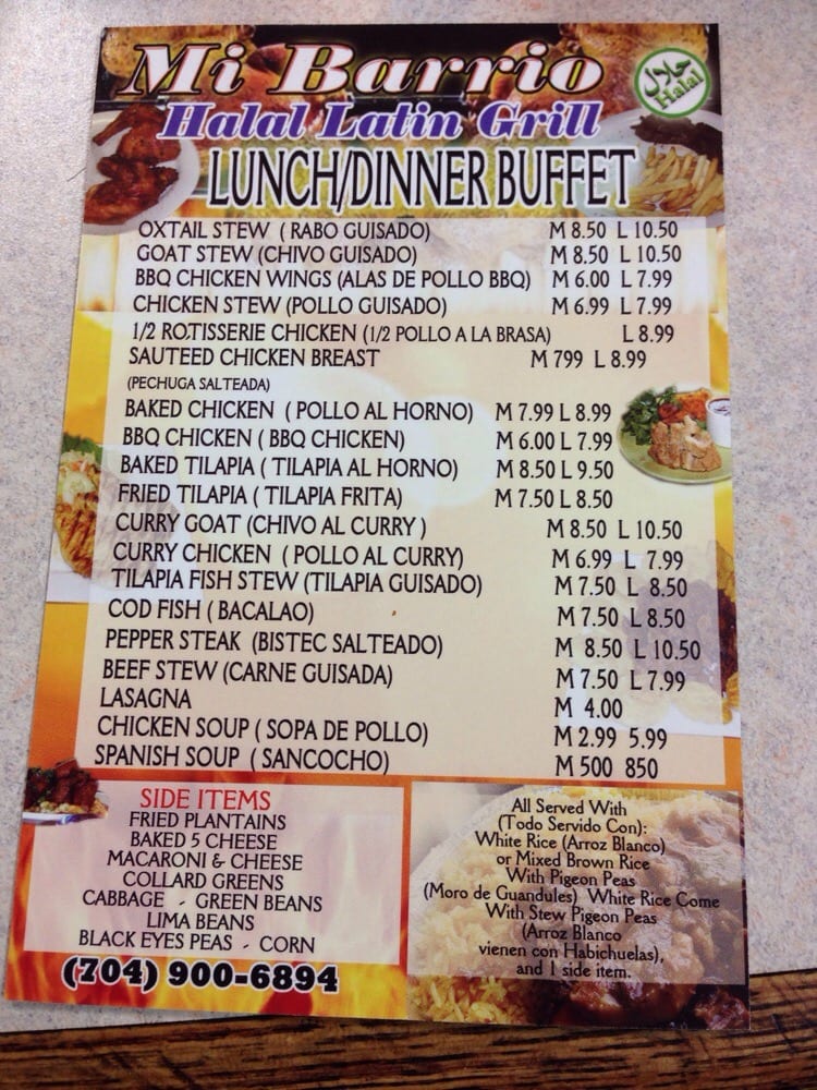 Introducing the menu at Mi Barrio Halal Latin Grill, located in Charlotte, NC, a hidden gem offering Dominican and halal cuisine. Known for their flavorful dishes and generous portions, this casual restaurant caters to vegans and vegetarians with a variety of options. Customers rave about the chicken over rice, oxtail stew, empanadas, and tilapia with two rice dishes. The friendly staff, reasonable prices, and wide range of food choices make this spot a must-visit. Whether you're a fan of Caribbean flavors or looking to try something new, Mi Barrio Halal Latin Grill is sure to satisfy your cravings. Don't miss out on this authentic dining experience that brings together the best of Latin and halal cuisine.